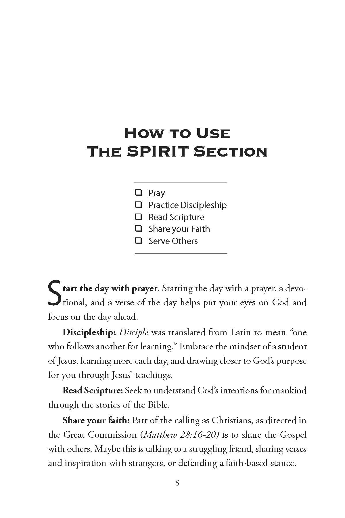 With simple-to-follow items to address each day, the user builds healthy habits such as daily prayer, meditation, reading, exercise, nutrition, and more. This tool was designed with the busy Christian man in mind, whether they are in a boardroom or on a boom lift